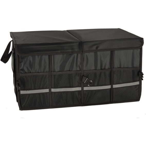 Przenośna torba do auta z przegródkami mocowanymi na rzepy pozwoli Ci wygodnie przewozić rzeczy o różnych gabarytach. Wyróżnia ją odblaskowa taśma z boku, która zdecydowanie ułatwia rozpakowywanie bagażu po zmierzchu.