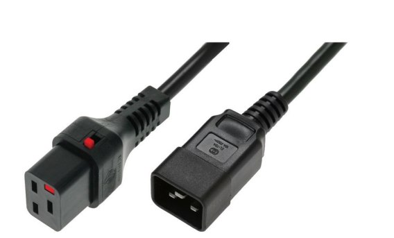 Przewód o długości 2m w kolorze czarnym, posiadający złącze proste IEC C20 oraz proste IEC C19, wyposażony w system blokujący IEC LOCK. Zastosowanie takiego przewodu zabezpiecza każde podłączone do niego urządzenie przed nagłą utratą zasilania w wyniku przypadkowego wypięcia, wibracji lub innych działań. Niewątpliwą zaletą systemu IEC LOCK jest jego uniwersalność, gdyż przewody lub wtyki z blokadą mogą być stosowane ze wszystkimi standardowymi gniazdami IEC. Zblokowanie następuje automatycznie po wpięciu przewodu, zaś jego odłączenie możliwe jest dopiero po zwolnieniu przycisku blokady. Przewód posiada uziemienie, co dodatkowo gwarantuje bezpieczeństwo podłączonych urządzeń.