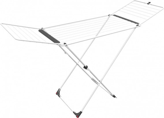 Bezpieczna, kompaktowa i łatwa w użyciu Składane nogi w kształcie litery X sprawiają, że rozkładanie suszarki jest niezwykle proste. Specjalna blokada zabezpiecza ją przed przypadkowym rozłożeniem. Wyposażona również w blokadę skrzydeł. Solidny stalowy stelaż zapewnia trwałość i stabilność.